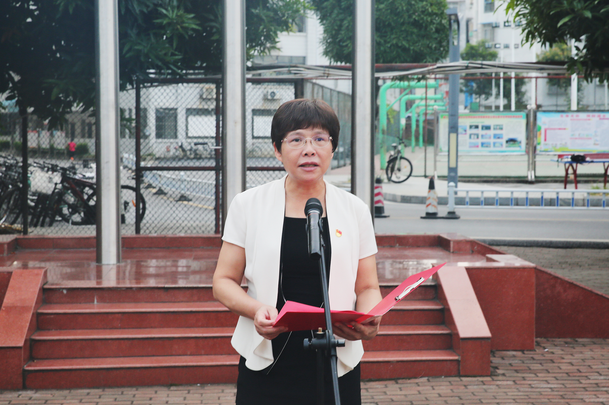 学校党委副书记赵丽娟在百城校区田径运动场国旗下讲开学第一课。