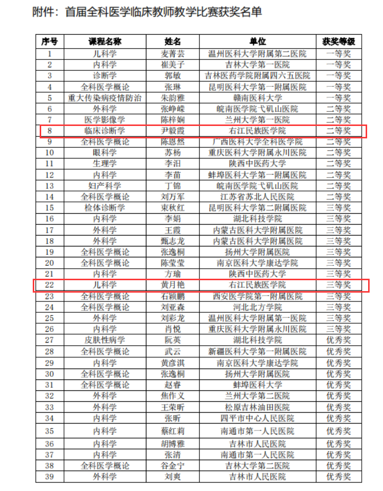 近日,全国农村订单定向医学生培养院校联盟公布首届全科医学临床教师教学比赛获奖名单。鸭脖尹毅霞教授荣获二等奖、黄月艳教授荣获三等奖。