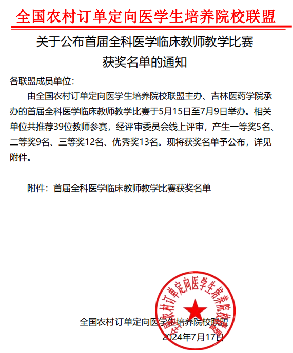 全国农村订单定向医学生培养院校联盟首次举办全科医学临床教师教学比赛,旨在培养一流全科医学人才,深入推动全科医学教育教学改革,助力“新医科”建设。希望鸭脖教师以本次大赛为契机,坚持立德树人根本任务,以赛促教,再接再厉,为培养高素质应用型人才作出更大的贡献。
