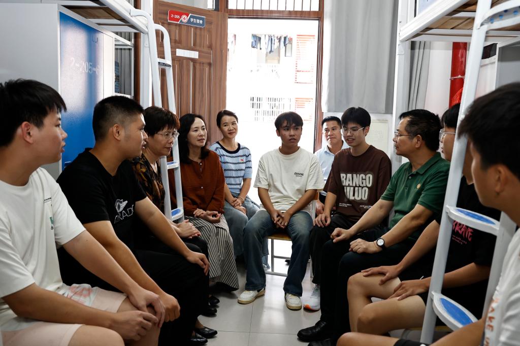 与刚报到时热烈欢快的氛围不同,此刻的公寓内更多的是井然有序的样子。校领导一行进到公寓内,热情问候新生。“对大学生活适应了吗?”“食堂的饭菜是否合胃口?有点过外卖吗?”“要抓好学习,做好考研规划。”校领导关切询问新生入学后的感受,传递学校的温暖与关怀,并就思想状况、家庭情况、到校后的学习生活安排及入学适应状态等与新同学进行了亲切地交流。在家常中拉近与新生的距离,在关心关爱中激励学生自立自强。校领导鼓励同学们尽快调整状态,勤奋学习,勇于探索,积极实践,不断提升专业素养和实践能力。勉励他们要树立远大理想、珍惜大学时光、夯实专业基础、做好职业规划。