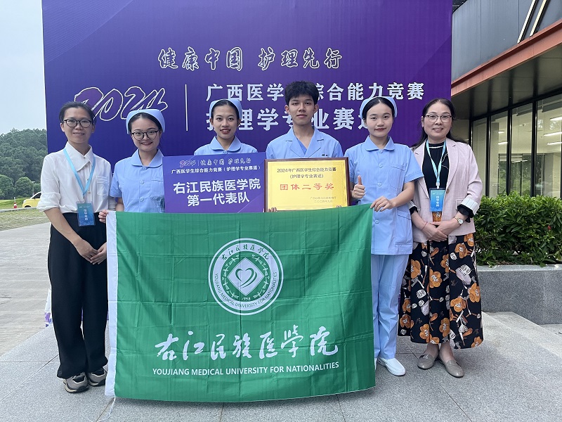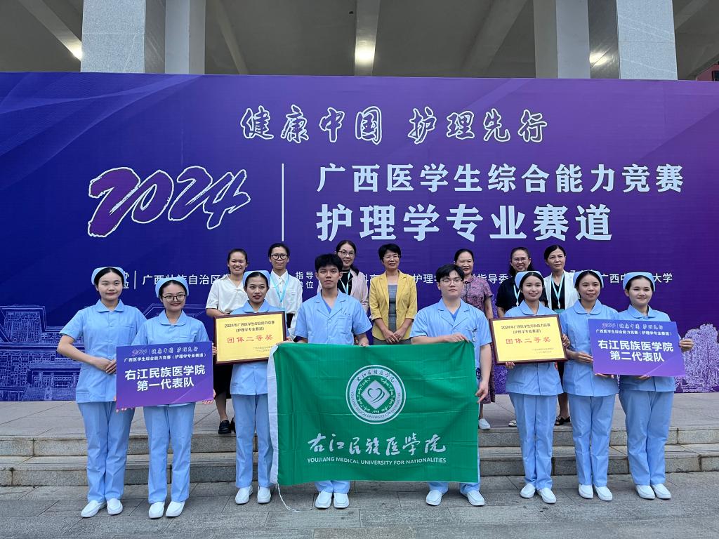 2024年9月25日,在广西中医药大学举办的2024年广西高校大学生医学技术技能大赛(护理学专业赛道)中,鸭脖派出的两支代表队智勇双全、沉着应战、密切配合、奋力拼搏,均荣获团体二等奖。第一代表队由2021级护理学专业曾晓琦、卢迅、黄钰、覃政桂四位同学组成,选派沈艳清、黄宏、梁春荣、朱旺乔担任指导老师;第二代表队由2021级护理学专业麻霄霖、黄海叁、苏柯、黄思宇四位同学组成,选派陆青梅、赵丽红、李坚硕、陶嘉怡担任指导老师;本次参赛由护理学院院长张莉芳教授带队。