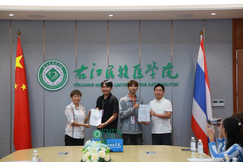 9月15日上午,交换生团开班欢迎仪式在校本部八桂书院活动厅举行,公共卫生学院院长郭蕊、国际合作与交流中心副主任张剑出席欢迎仪式,并向交换师生赠送校徽、中秋月饼,欢迎泰国师生加入右医大家庭、共度中秋佳节。仪式结束后,交换生团还参观了校史馆、附属医院等校园环境。
