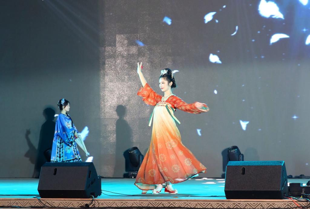 朗诵与合唱《强军战歌》彰显了军人的豪迈气概;服饰走秀《华夏霓裳,文化瑰宝》展示了中华传统文化的魅力;男女声对唱《为了谁》和情景剧《可爱的中国》让观众感受到了家国情怀的力量;男声独唱《万里长城永不倒》更是唤起了大家的民族自豪感;情景剧《中国青年之榜样,扶贫之花黄文秀》激励着青年学子们勇敢前行。
