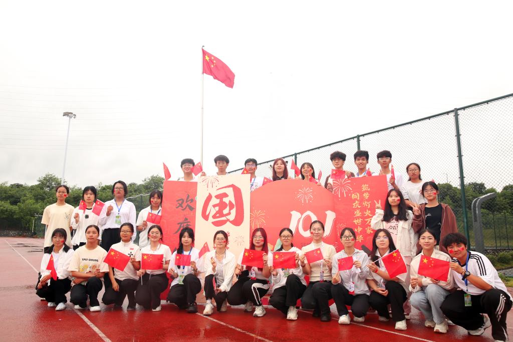全体师生齐唱《我和我的祖国》。悠扬的旋律在田径场上空回荡,大家挥舞着手中的国旗,用歌声表达对祖国的祝福。歌声中,充满着对祖国的热爱和自豪,五星红旗迎风飘扬,嘹亮的歌声响彻校园,奋斗的图景正在徐徐展开。