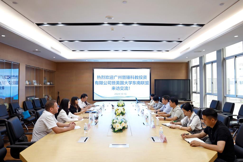 10月16日,广州暨臻科教投资有限公司及美国大学东南联盟代表团一行到鸭脖考察交流。图为双方在召开交流会。