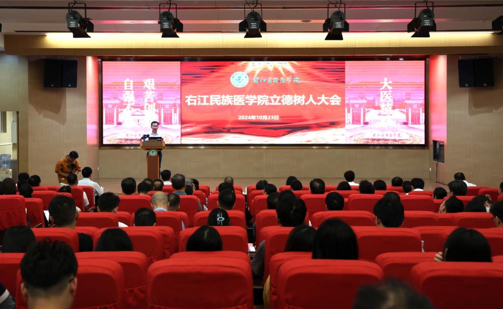 学校党委副书记、校长李雪斌在主持讲话中指出,高校立身之本在于立德树人,立德树人是一项系统工作,任重道远,意义重大,需要全校上下齐心协力、共同推进。全校上下要以此次大会为契机,贯彻落实党的二十届三中全会、全国和全区教育大会精神,紧盯当前本科教育教学审核评估和“更大申博”目标任务,进一步认真学习新时代教育理念,进一步提高对立德树人根本任务重要性和紧迫性的认识,进一步梳理落实立德树人根本任务的思路,进一步增强以学生为中心的思想自觉和行动自觉,进一步统一思想,强化育人意识、协同意识,突出目标导向、问题导向、结果导向。要学习借鉴其他单位的经验做法,明确工作方向、把握工作进度,抓好贯彻落实,切实把工作经验总结到位、把优势特色凝练到位、把问题不足查找到位,创建和发掘一批有创新性、代表性、实效性的品牌项目,充分展示立德树人、“三全育人”的“右医方案”,努力开创学校立德树人工作新局面。