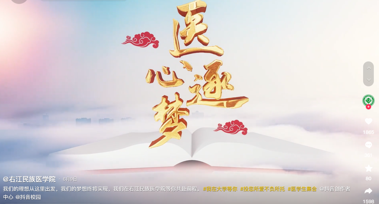 学校官方抖音号已发布1073个原创视频,图为视频《医心逐梦》。