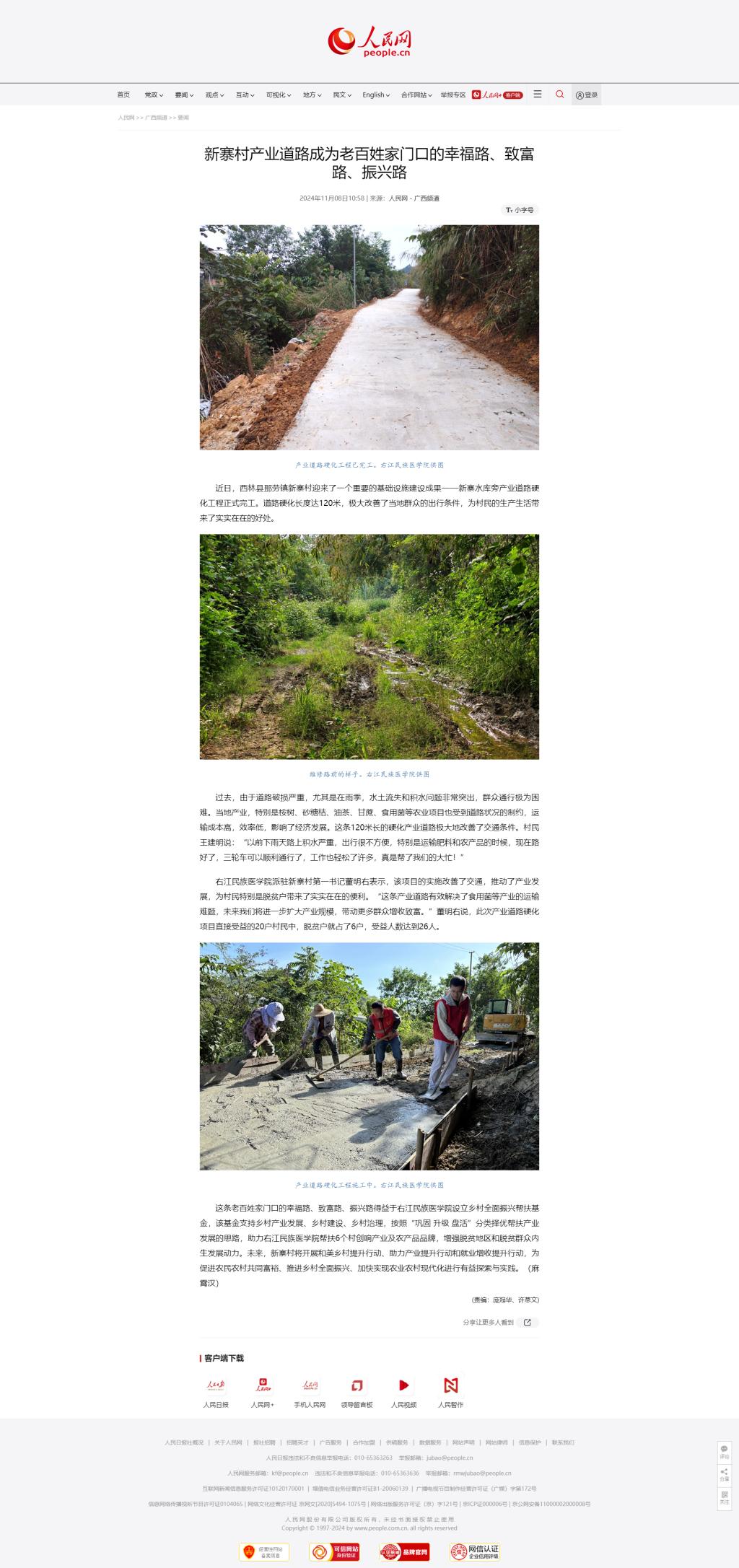 11月8日,人民网以《新寨村产业道路成为老百姓家门口的幸福路、致富路、振兴路》为题,报道鸭脖帮扶村西林县那劳镇新寨村新寨水库旁产业道路硬化工程竣工,极大改善了当地群众的出行条件,为村民的生产生活带来了实实在在的好处。
