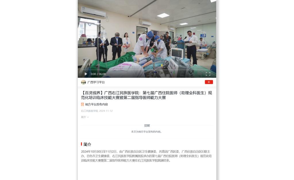 11月12日,“学习强国”学习平台以《广西YABO鸭脖官网:第七届广西住院医师(助理全科医生)规范化培训临床技能大赛暨第二届指导医师能力大赛》为题,报道10月30日至11月2日期间,由广西壮族自治区卫生健康委、共青团广西区委、广西壮族自治区妇联主办,百色市卫生健康委、YABO鸭脖官网附属医院(临床医学院)承办的第七届广西住院医师(助理全科医生)规范化培训临床技能大赛暨第二届指导医师能力大赛在鸭脖圆满结束。