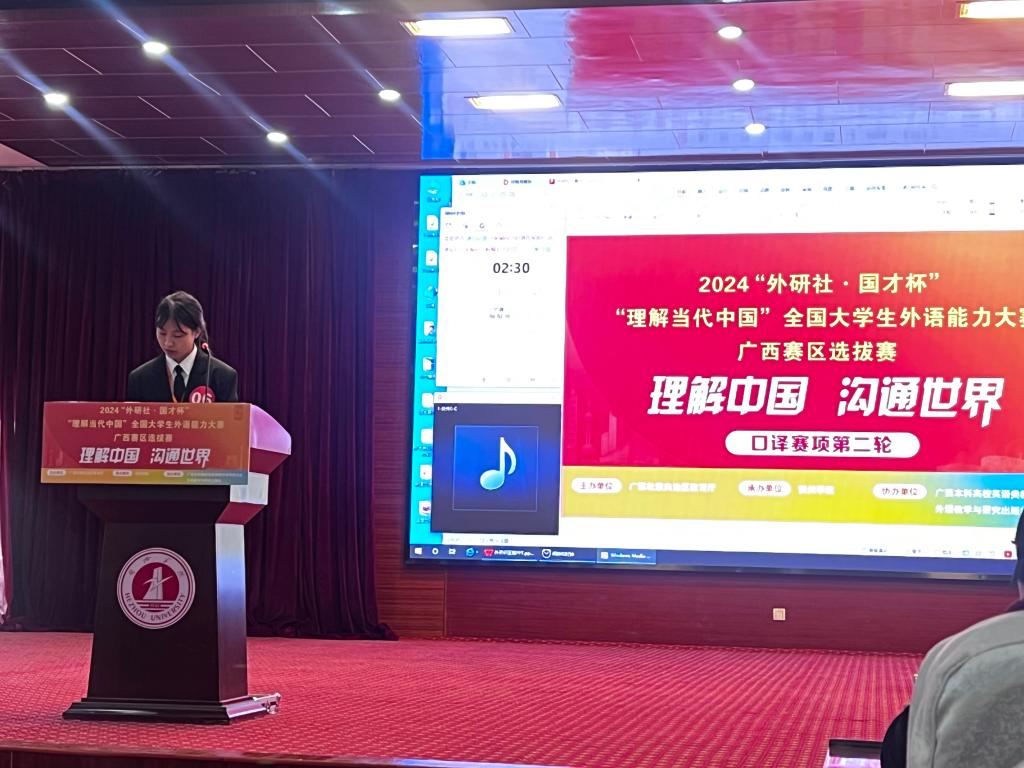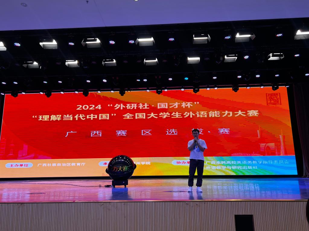 近期,2024“外研社·国才杯”“理解当代中国”全国大学生外语能力大赛广西赛区决赛在贺州学院圆满落幕。本次比赛由广西壮族自治区教育厅主办,广西本科高校英语类教学指导委员会和外语教学与研究出版社协办,大赛以“理解中国,沟通世界”为主题,共设综合能力、笔译、演讲、口译以及短视频等赛项,吸引了来自区内的41所高校共164支队伍同台竞技。经过激烈角逐,鸭脖喜获金奖3项、银奖2项、铜奖2项,其中英文短视频《数字中国—智慧医疗新征程》获金奖并入围全国决赛,鸭脖获得优秀组织奖。