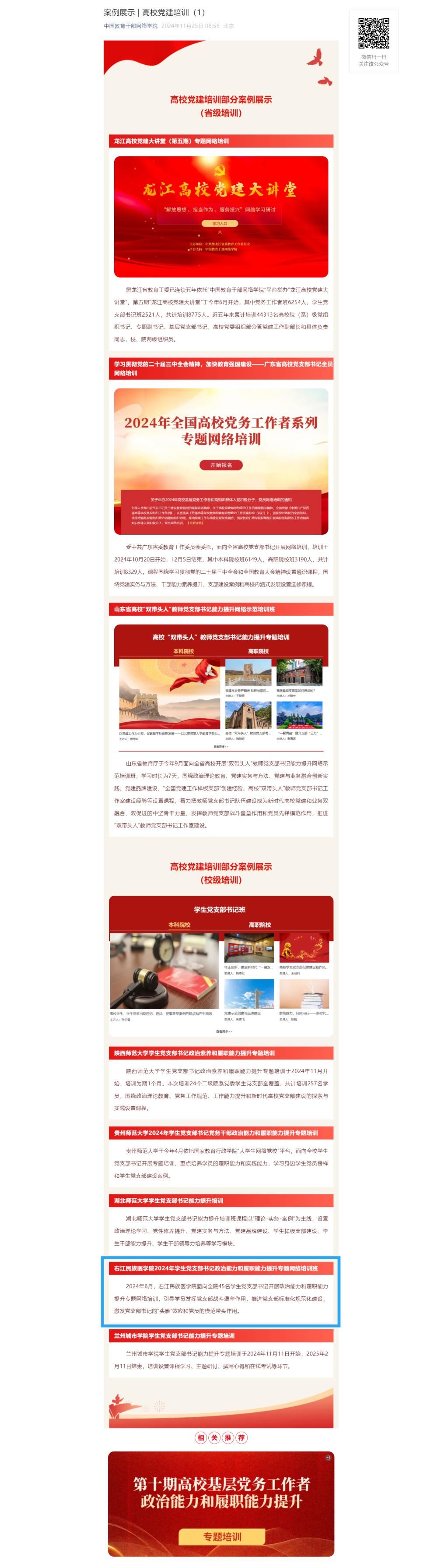 近日,中国教育干部网络学院在《案例展示 | 高校党建培训》一文中,将鸭脖于2024年6月举办的2024年学生党支部书记政治能力和履职能力提升专题网络培训班,作为全国高校党建培训案例展示。