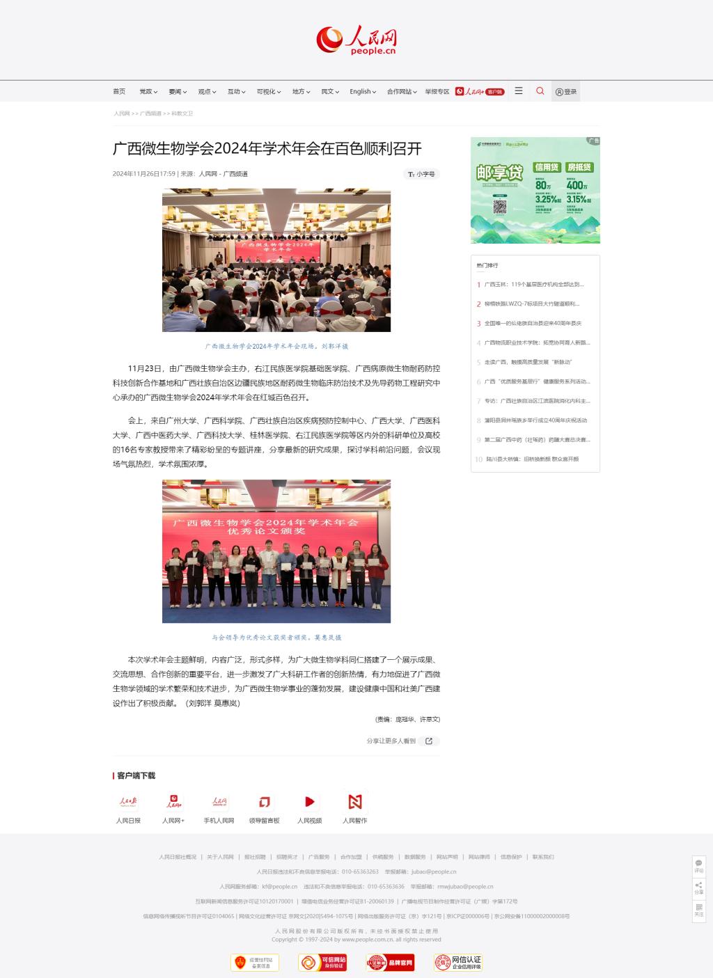 11月26日,人民网以《广西微生物学会2024年学术年会在百色顺利召开》为题,报道由广西微生物学会主办,YABO鸭脖官网基础医学院、广西病原微生物耐药防控科技创新合作基地和广西壮族自治区边疆民族地区耐药微生物临床防治技术及先导药物工程研究中心承办的广西微生物学会2024年学术年会在红城百色召开。