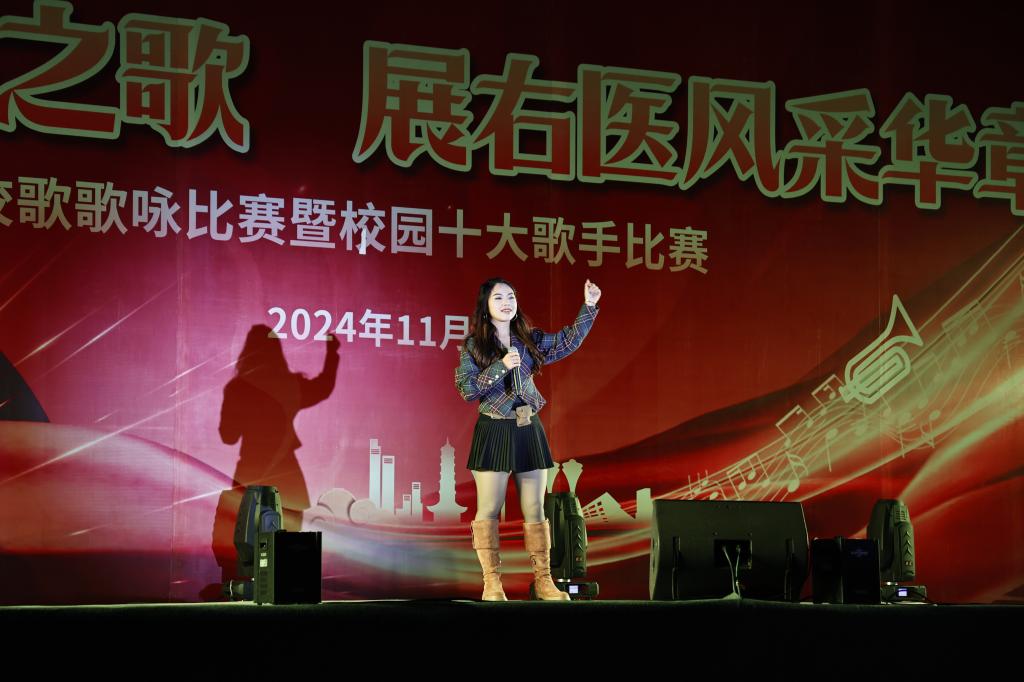 11月29日晚,鸭脖举行第三十二届“青春无畏,医路‘声’花”校园十大歌手比赛总决赛。图为十大歌手冠军韦珊珊演唱《爱与痛的边缘》。