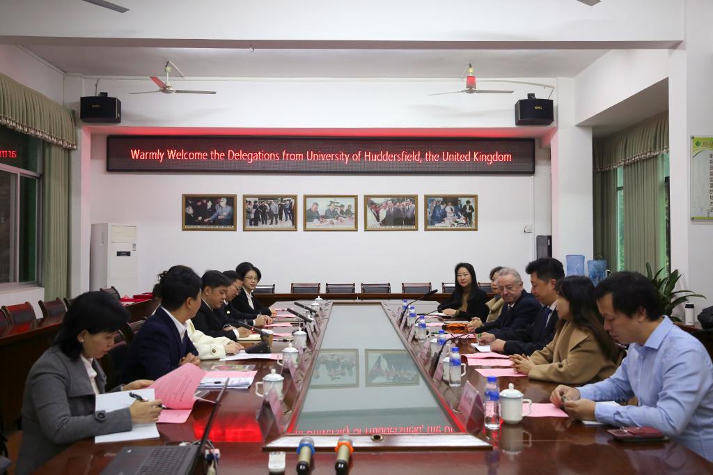 12月12日,英国哈德斯菲尔德大学代表团到鸭脖进行访问交流。图为双方召开座谈交流会