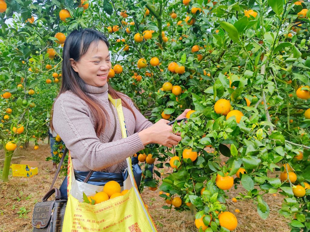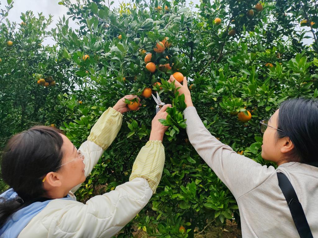 活动现场,教职工们背着袋子、手拿箱子穿梭在皇帝柑树林中,仔细挑选金黄色熟透的果子,轻轻地摘下,通过“以购代捐”“以买代帮”方式,倾力倾情帮助农户增收。