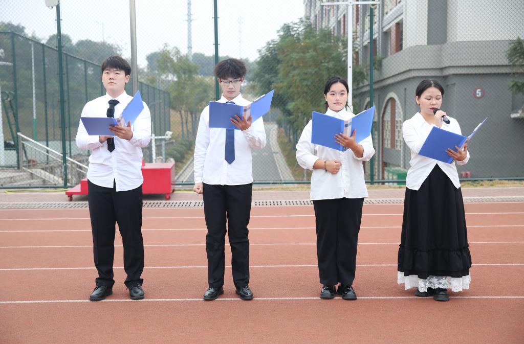 在百东校区田径场的国旗下,学生代表进行朗诵。