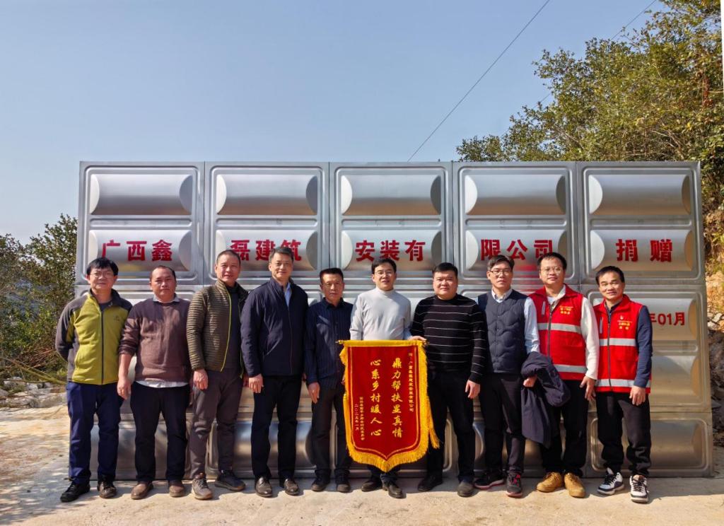 在蓄水池投入使用当天,那务村民委员会主任农理成向爱心企业广西鑫磊建筑安装有限公司赠送锦旗,并转达那务屯全体群众的感激之情。