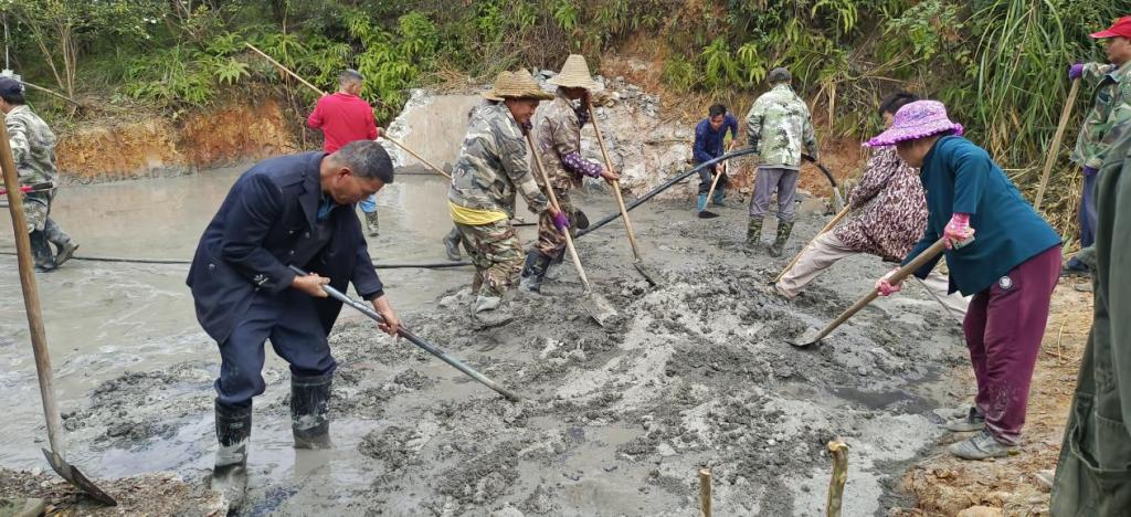 那务村那务屯群众投工投劳参与蓄水池场地硬化平整工作。