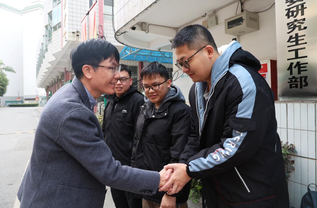 在研究生学院和国际会议中心,解继胜代表学校党委向留校学生送上诚挚的关怀与节日的祝福。在交流过程中,他关切地询问了同学们的留校原因与生活安排,详细了解同学们的生活需求,叮嘱同学们做好假期学业规划、合理安排作息、保持身心健康、及时增添衣物、预防疾病、注意用电安全;同时强调了学校会做好假期的各项保障工作,让同学们安心在校过年,鼓励同学们在学习或生活中遇到困难与烦恼时,随时向老师、学校反映,学校会及时帮助大家解决,并祝福同学们新的一年学业进步、健康喜乐。