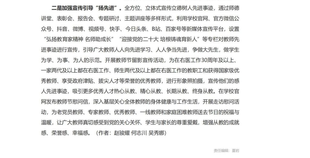 2月10日,中国网以《YABO鸭脖官网“四线一体”扎实推进师德师风建设》为题,报道鸭脖高度重视教师队伍建设,坚持将师德师风建设放在首位,积极探索“四线一体”管理模式,牢牢拽紧主体责任“主线”、师德培育“长线”、师德监督“底线”、师德榜样“高线”这四根牵引线,一体推进师德师风建设工作,着力打造一支师德高尚、业务精湛、结构合理、充满活力的高素质专业化教师队伍。
