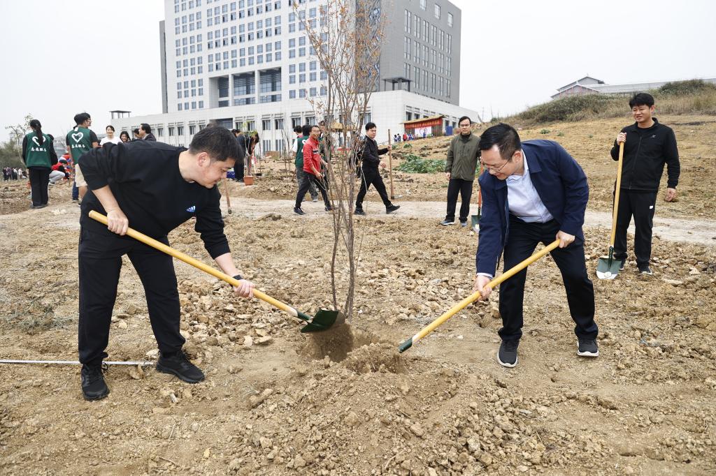 3月12日上午,鸭脖组织开展主题为“同心共植团结林 润心耕耘幸福园”的植树活动。图为党委书记李雪斌和校长黄龙坚共植石榴树。