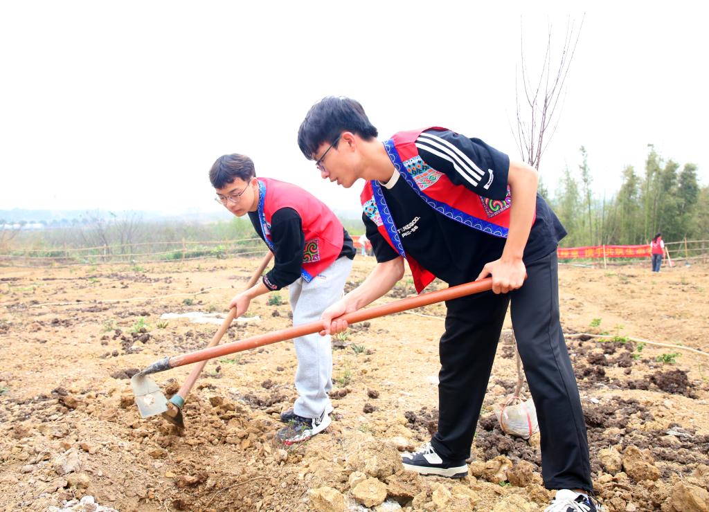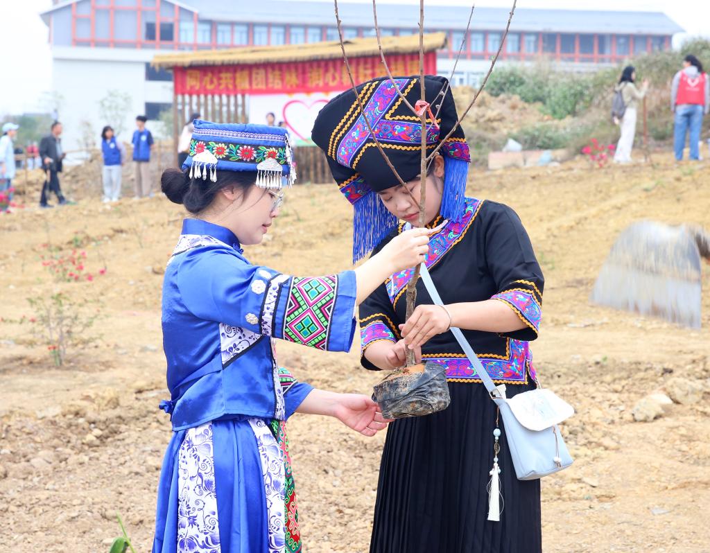 3月12日,鸭脖组织开展了一场主题为“同心共植团结林 润心耕耘幸福园”的植树活动,图为同学们身着少数民族服装参与到植树活动中。