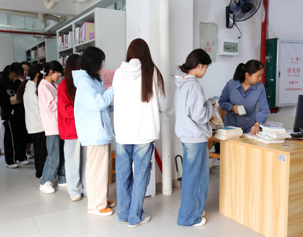 3月24日,“书香三月三,阅读正当时”主题活动在百城校区和百东校区同时举办。图为同学们正在排队办理借书。