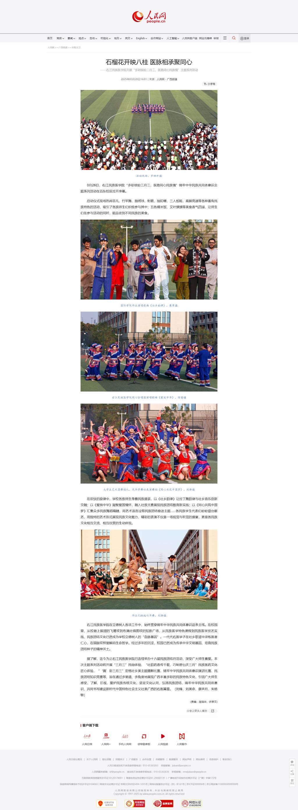 3月28日,人民网以《石榴花开映八桂 医脉相承聚同心》为题,报道鸭脖开展“多彩缤纷三月三,医路同心民族情”铸牢中华民族共同体意识主题系列活动启动仪式盛况。