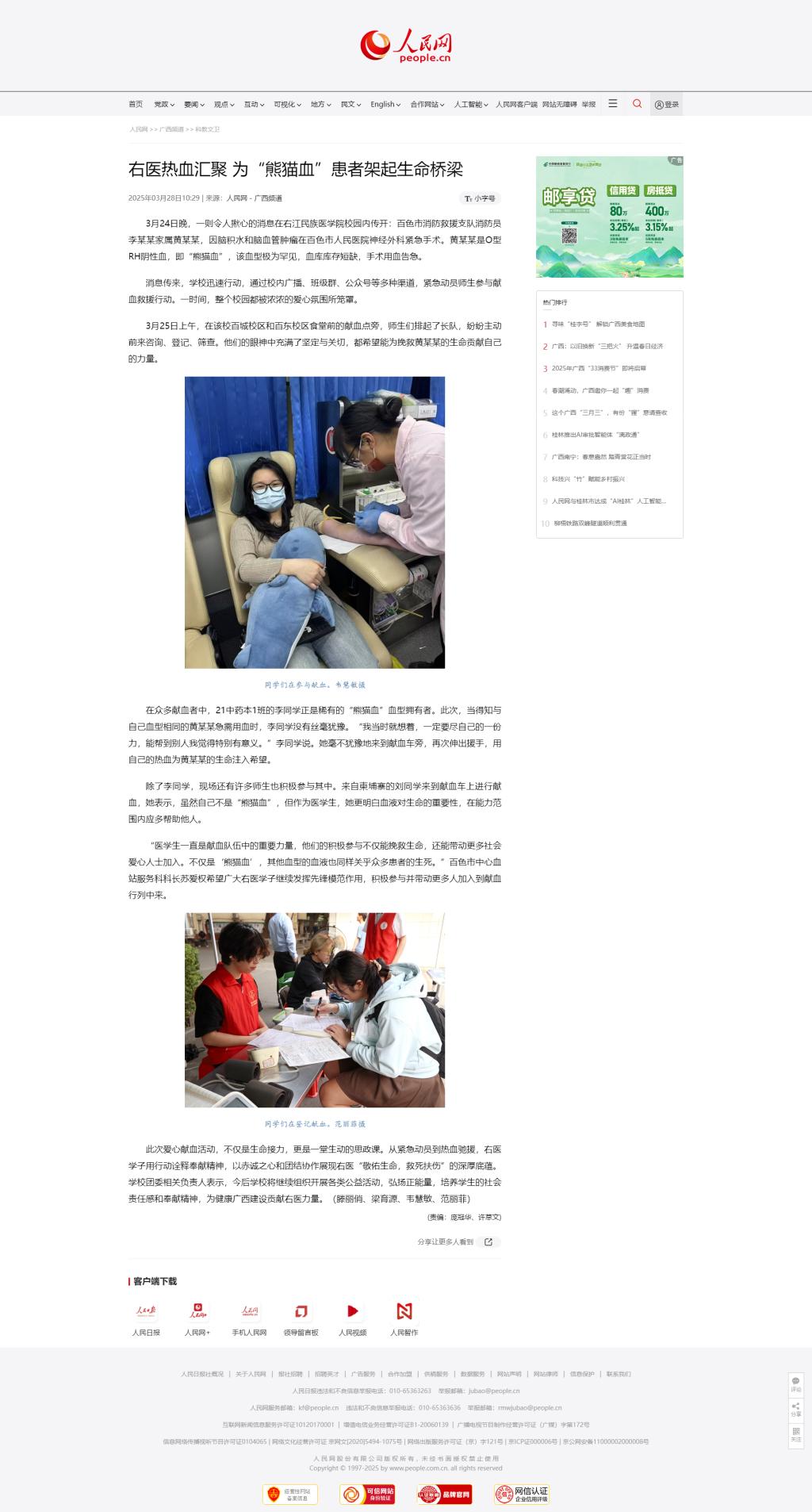 3月28日,人民网以《右医热血汇聚 为“熊猫血”患者架起生命桥梁》为题,报道鸭脖鸭脖师生积极为为“熊猫血”患者献血,用爱心架起生命桥梁。