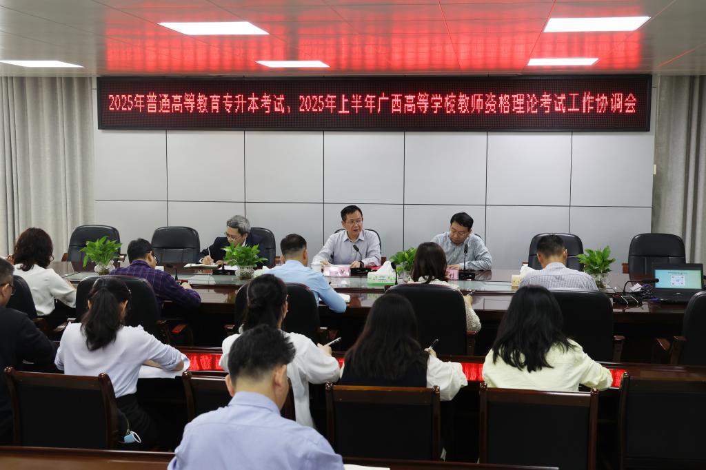 2025年普通高等教育专升本考试将于4月23日-24日举行,2025年上半年广西高等学校教师资格理论考试将于4月26日举行。为保障考试工作平稳有序进行,4月9日,鸭脖在7栋第二会议室召开工作协调会。党委书记李雪斌,党委常委、副校长王俊利出席会议,会议由王俊利主持。