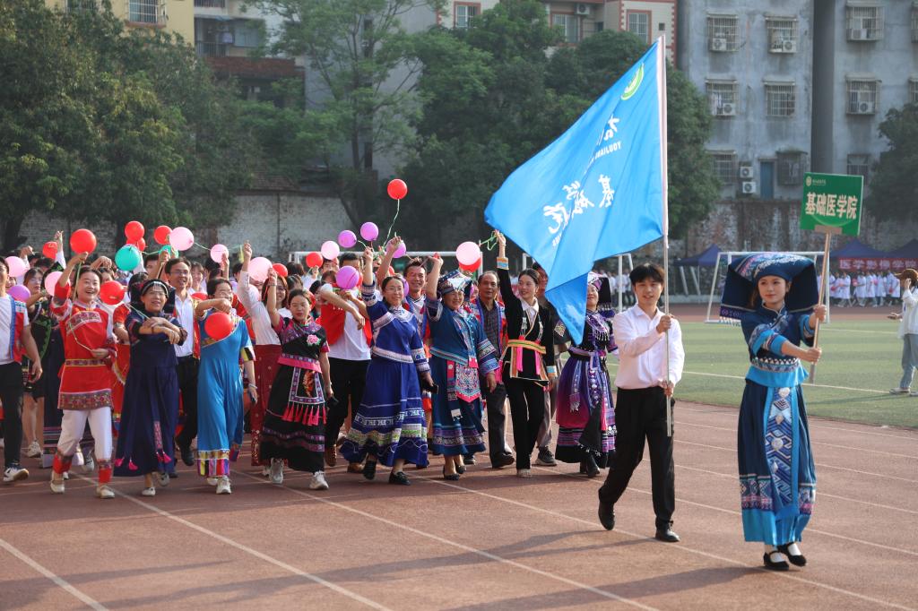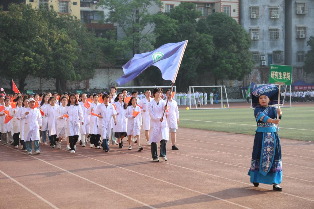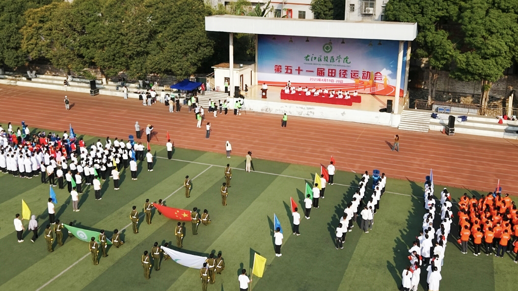 在欢快的暖场音乐中,第五十一届运动会开幕式正式开始。伴随着激昂的《运动员进行曲》,学校国旗队高举五星红旗率先入场,紧随其后的是裁判员方块队、机关代表方块队以及各二级学院方块队,他们踏着整齐有力的步伐,喊出嘹亮的口号,字字铿锵间尽显右医人朝气蓬勃的精神风貌。