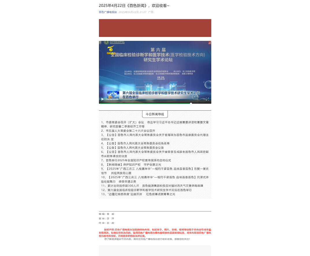 4月24日,百色广播电视台以《第六届全国临床检验诊断学和医学技术研究生学术论坛在百色举行》为题,报道由全国高等院校医学检验专业校际协作理事会主办、YABO鸭脖官网承办的第六届全国临床检验诊断学和医学技术(医学检验技术方向)研究生学术论坛在鸭脖举办。
