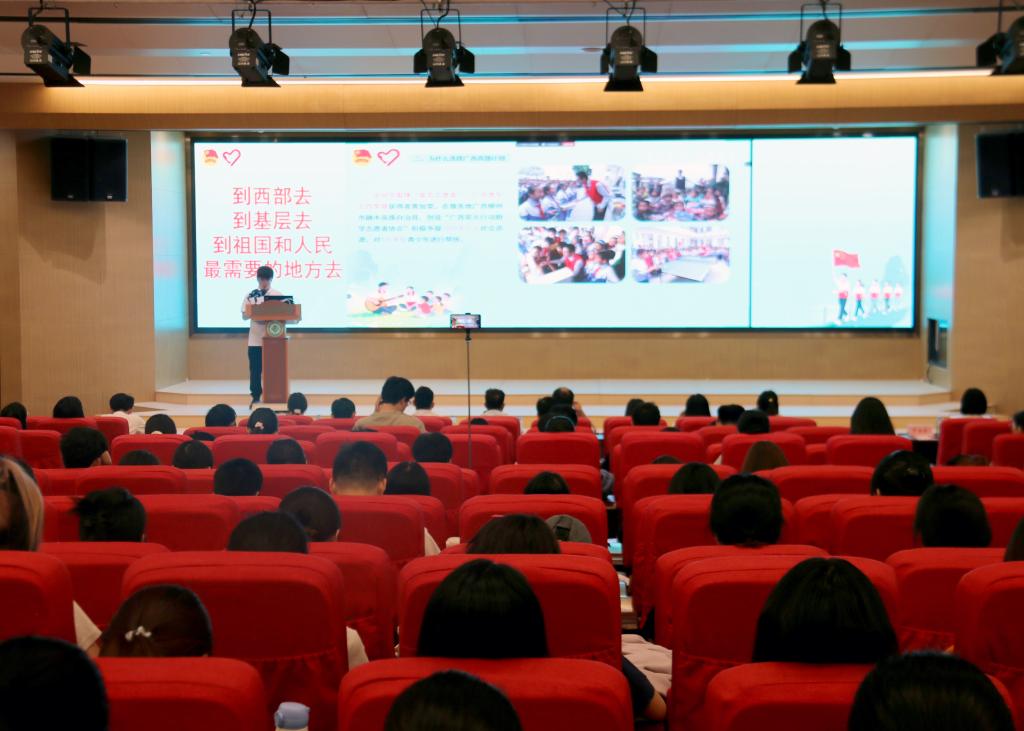 为积极响应国家鼓励青年扎根基层、服务西部的号召,进一步引导和激励高校毕业生投身到西部基层一线,主动融入国家发展大格局之中。4月23日下午,2025年广西大学生志愿服务西部计划招募宣讲活动在鸭脖百城校区国际会议中心学术报告厅举行,在百东校区设立分会场。广西大学生志愿服务西部计划宣讲团、鸭脖报名2025年西部计划项目的学生及2025届应届毕业生代表和怀揣热血的青年学子共赴这场“西行之约”。