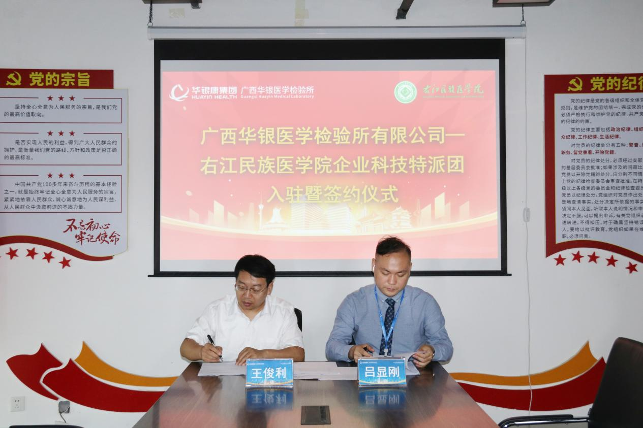 培训会后,企业科技特派团团长王俊利教授与华银康广西公司总经理吕显刚代表双方签署《广西企业科技特派团合作协议书》。未来,双方将围绕科研协同攻关、成果转化应用及人才联合培养等领域深化合作,共同构建“产学研用”一体化创新生态,助力广西精准医学与智慧医疗技术突破。