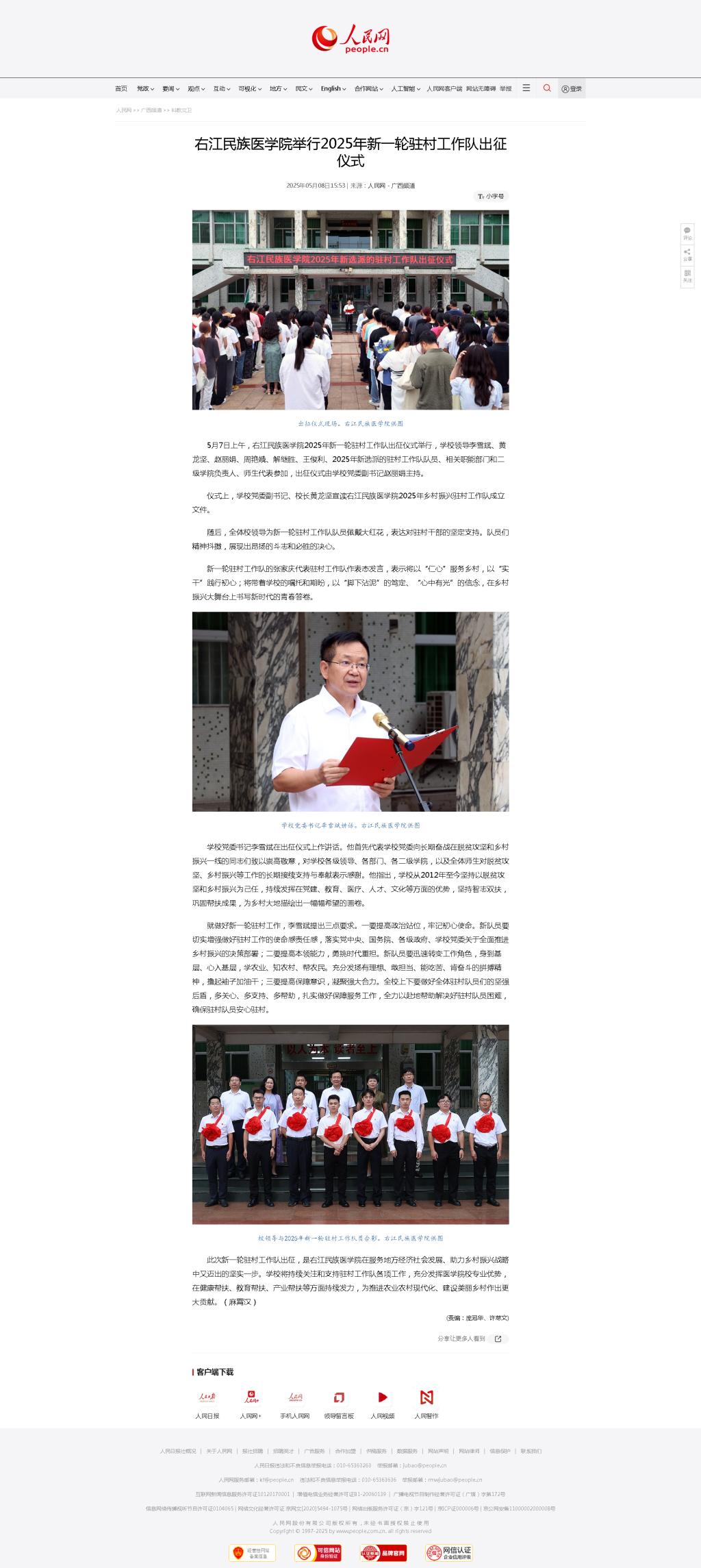 5月8日,人民网以《YABO鸭脖官网举行2025年新一轮驻村工作队出征仪式》为题,报道鸭脖2025年新任驻村工作队正式前往西林县开展驻村工作。