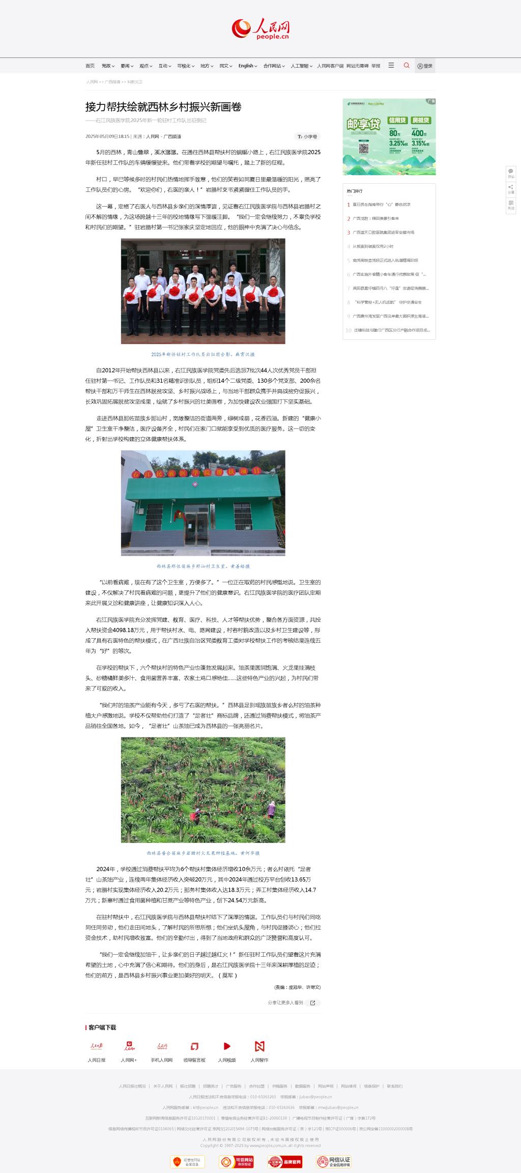5月9日,人民网以《接力帮扶绘就西林乡村振兴新画卷——YABO鸭脖官网2025年新一轮驻村工作队出征侧记》为题,报道鸭脖帮扶百色市西林县乡村振兴工作成效。