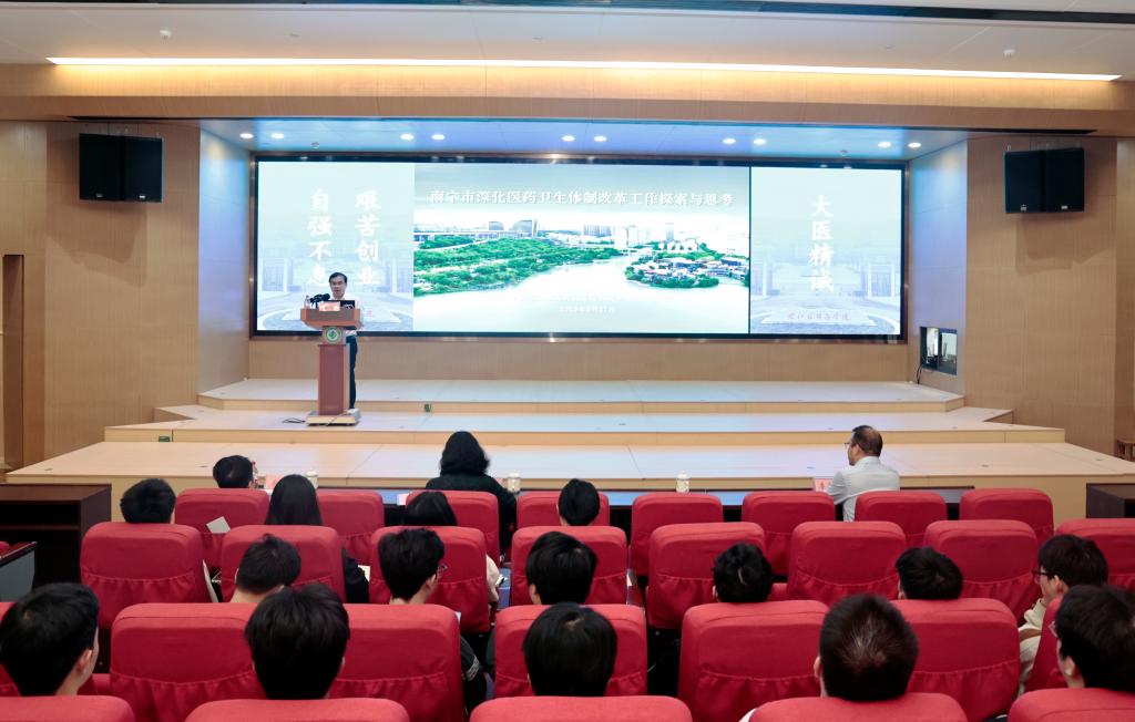 5月27日上午,南宁市卫生健康委员会党组书记、主任唐驰受邀在鸭脖百城校区国际会议中心作题为《南宁市深化医改工作的探索》的专题讲座。校党委常委、副校长周艳娥教授出席并主持讲座,人文与管理学院主要负责人,及师生代表300多人聆听讲座。
