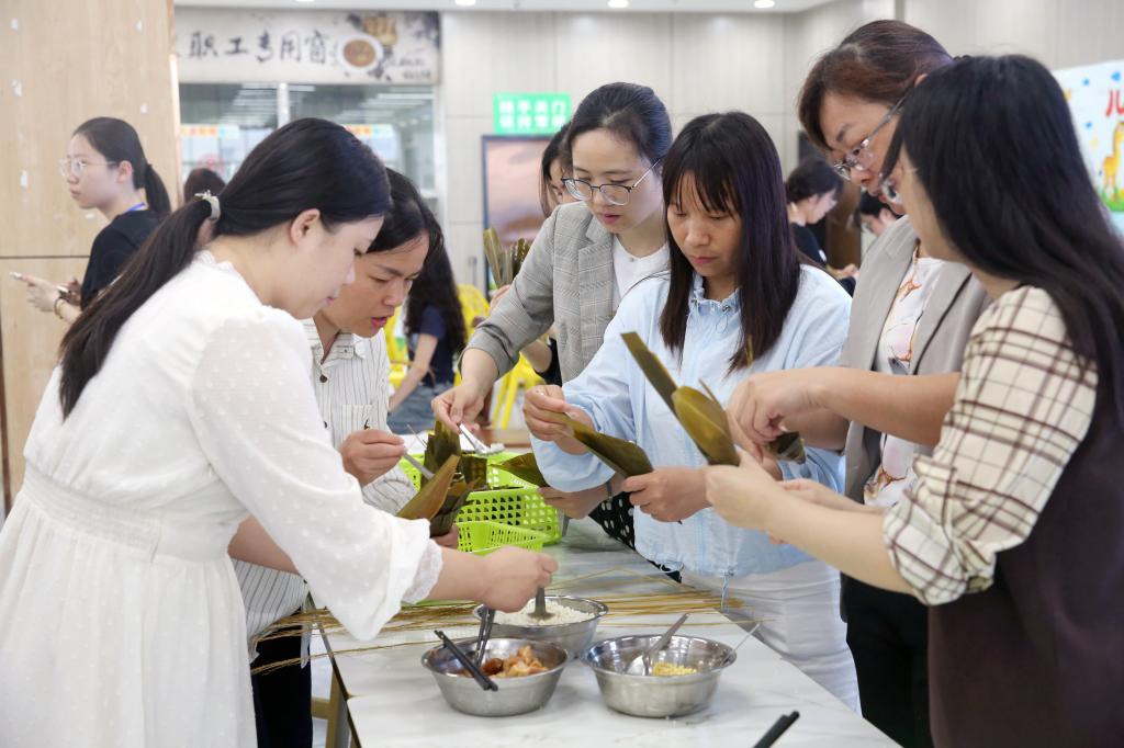 活动现场热闹非凡,洋溢着浓厚的节日氛围。翠绿的粽叶如翡翠般光泽诱人,雪白的糯米散发着淡淡的米香,色泽红润的肉块和绵密香甜的豆沙馅整齐地摆放在桌面上,空气中弥漫着粽叶与糯米的清香,让人不由自主地沉醉其中。
