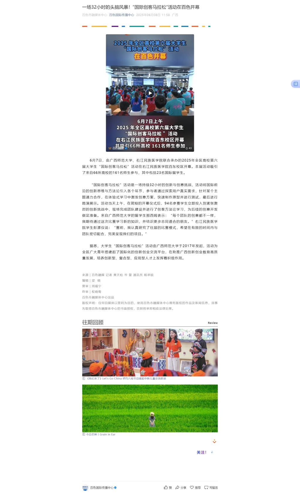 6月8日,百色国际传播中心以《一场32小时的头脑风暴!“国际创客马拉松”活动在百色开幕》为题,报道2025年全区高校第六届大学生“国际创客马拉松”活动在YABO鸭脖官网百东校区开幕。