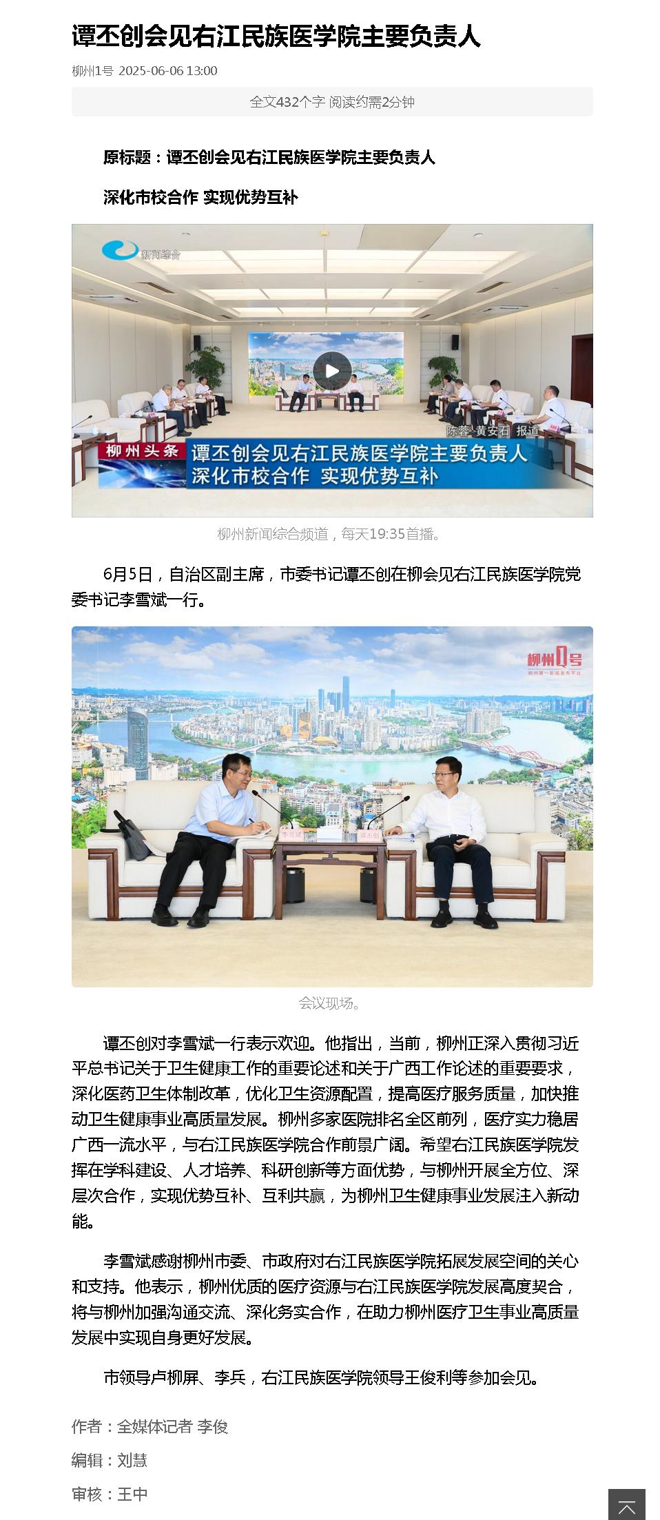 6月6日,《柳州新闻》以《谭丕创会见YABO鸭脖官网主要负责人》为题,报道自治区副主席、柳州市委书记谭丕创会见鸭脖党委书记李雪斌。