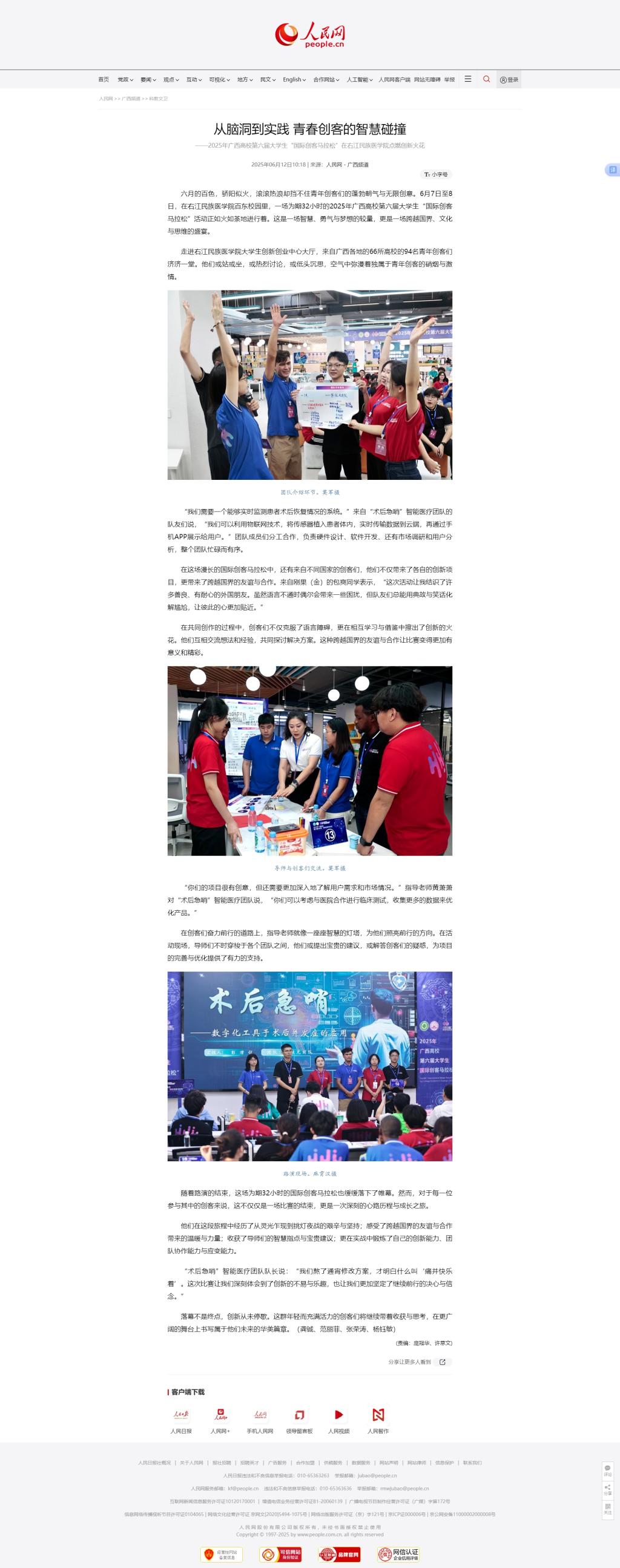 6月12日,人民网以《从脑洞到实践 青春创客的智慧碰撞——2025年广西高校第六届大学生“国际创客马拉松”在YABO鸭脖官网点燃创新火花》为题,报道2025年广西高校第六届大学生“国际创客马拉松”的热烈赛况。
