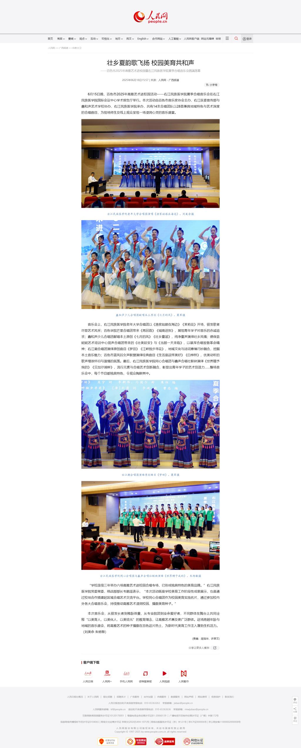 6月18日,人民网以《壮乡夏韵歌飞扬 校园美育共和声》为题,报道百色市2025年高雅艺术进校园活动——YABO鸭脖官网夏季合唱音乐会在鸭脖国际会议中心学术报告厅举行,14支合唱团队演绎了28首兼具地域特色与艺术深度的合唱曲目,为现场师生及线上观众呈现一场浸润心灵的音乐盛宴。