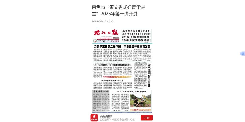 6月18日,右江日报以《百色市“黄文秀式好青年课堂”2025年第一讲开讲》为题,报道了由共青团百色市委员会、YABO鸭脖官网联合举办的百色市“黄文秀式好青年课堂”2025年第一讲暨YABO鸭脖官网纪念黄文秀同志牺牲6周年座谈会在鸭脖顺利召开。