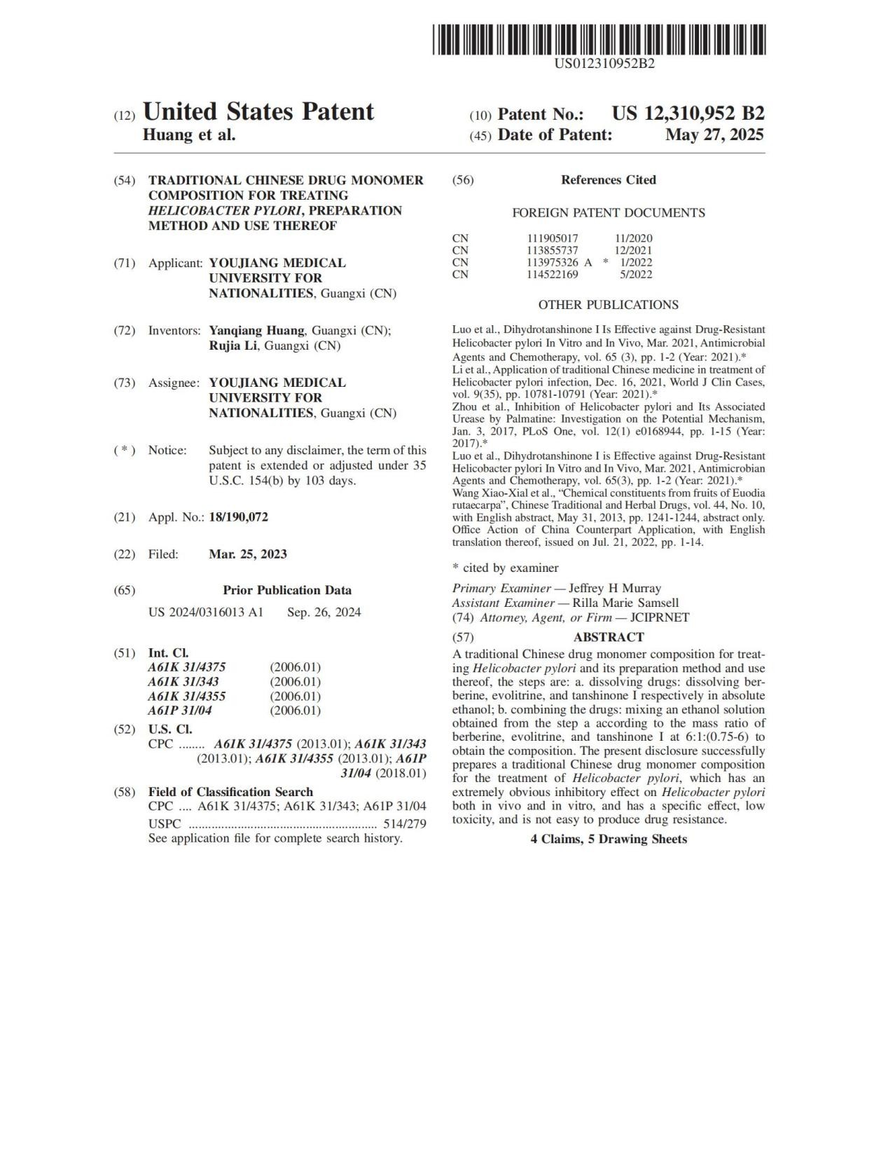 近日,鸭脖耐药微生物感染防治研究中心主任黄衍强教授团队的科研成果《一种治疗幽门螺杆菌中药单体组合物及其制备方法和应用》通过《专利合作条约》(PCT)途径申请,正式获得美国专利商标局授权(专利号:US 12,310,952B2)。该专利是鸭脖首次获得PCT美国发明专利授权,标志着鸭脖幽门螺杆菌防治研究水平进一步提升并得到国际认可,也意味着鸭脖在国际化知识产权布局上迈出了关键一步。