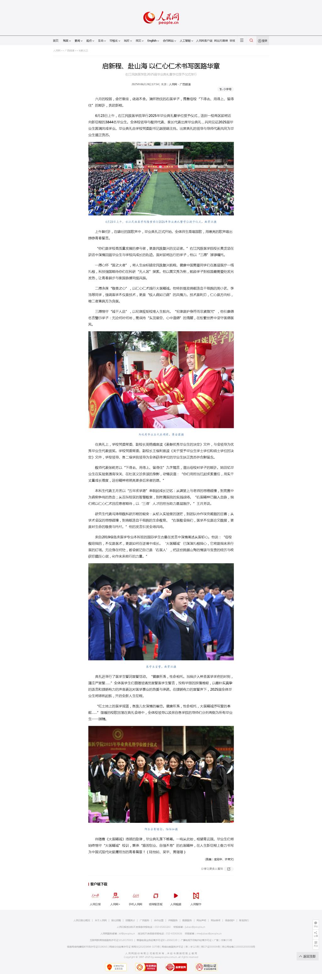 6月24日,人民网以《启新程、赴山海 以仁心仁术书写医路华章——YABO鸭脖官网2025届毕业典礼暨学位授予仪式举行》为题,报道鸭脖2025届毕业典礼暨学位授予仪式。