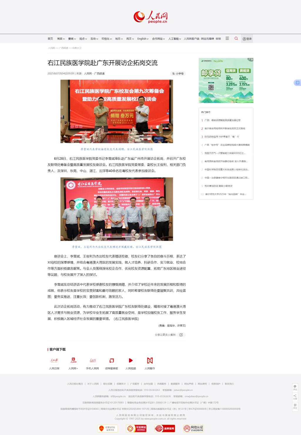 7月4日,人民网以《YABO鸭脖官网赴广东开展访企拓岗交流》为题,报道了鸭脖党委书记李雪斌率队赴广东省广州市开展访企拓岗交流,并召开广东校友联络处筹备会暨高质量发展校友座谈会,有力推动了YABO鸭脖官网广东校友联络处建设,精准对接了粤港澳大湾区人才需求与就业资源,为学校毕业生拓展了高质量就业空间。