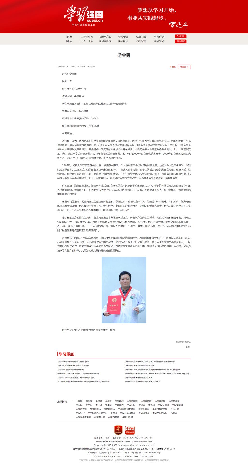 4月18日,学习强国平台报道鸭脖附属医院全科医学科主治医师游金勇无偿献血事迹。游金勇25年来献血130次,献血总量达5.13万毫升,累计3次荣获全国无偿献血奉献奖金奖而获得全国无偿献血最高奖项——全国无偿献血奉献奖终身荣誉奖、全国无偿献血志愿服务奖终身荣誉奖。