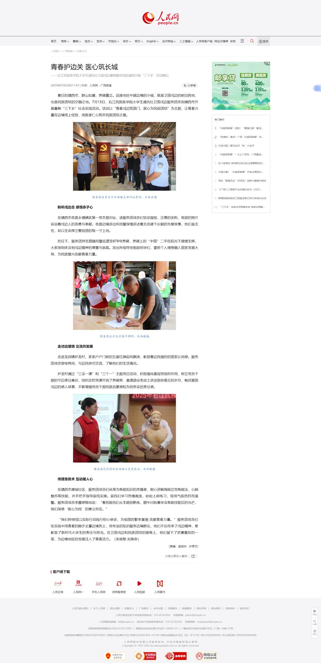 7月24日,人民网以《青春护边关 医心筑长城》为题,报道了YABO鸭脖官网大学生通讯社卫国戍边服务团来到靖西市开展暑期“三下乡”社会实践活动。活动以“青春戍边筑国门,医心为民促团结”为主题,让青春力量在边境线上绽放,用医者仁心筑牢民族团结之基。