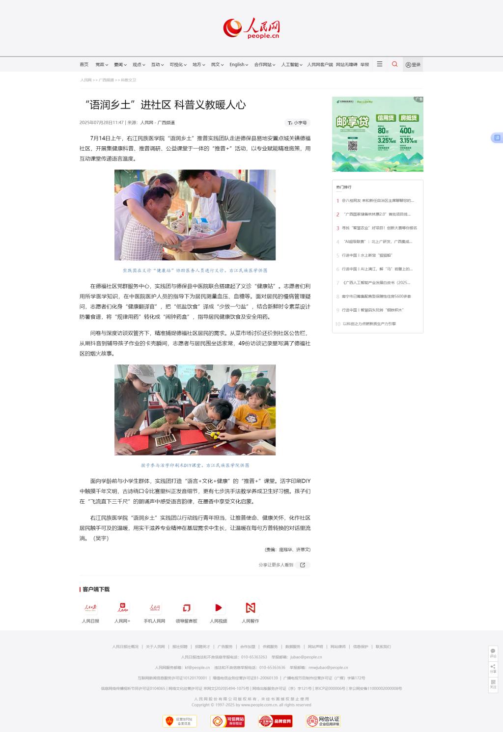 7月28日,人民网以《“语润乡土”进社区 科普义教暖人心》为题,报道了鸭脖“语润乡土”推普实践团队走进德保县易地安置点城关镇德福社区,开展集健康科普、推普调研、公益课堂于一体的“推普+”活动,以专业赋能精准施策,用互动课堂传递语言温度。