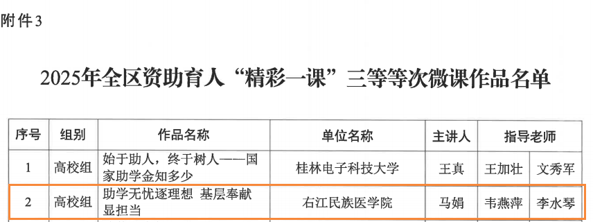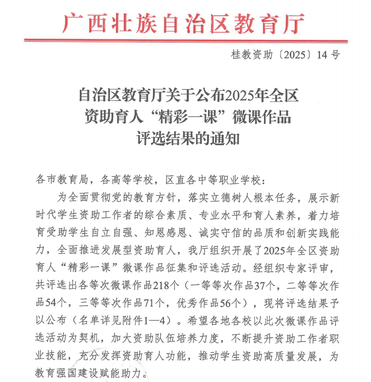 为落实立德树人根本任务,不断提升资助工作者综合素质、专业水平和育人素养,鸭脖认真组织遴选微课作品参加2025年全区资助育人“精彩一课”微课作品征集和评选活动。报送的马娟老师微课作品《助学无忧逐理想 基层奉献显担当》荣获三等等次。